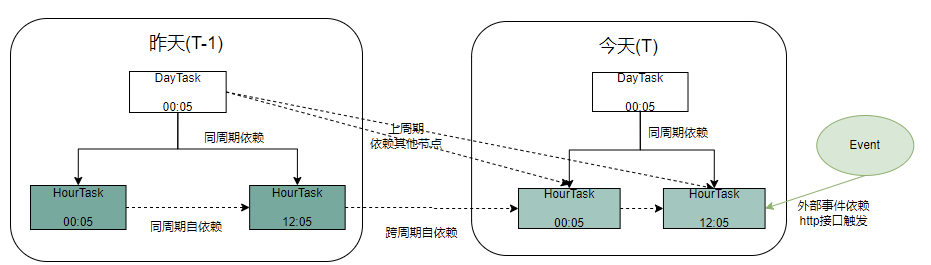 · 外部事件触发依赖/任务实例回调:通过外部事件或任务执行结果回调触发(如支付完成事件触发对账任务);