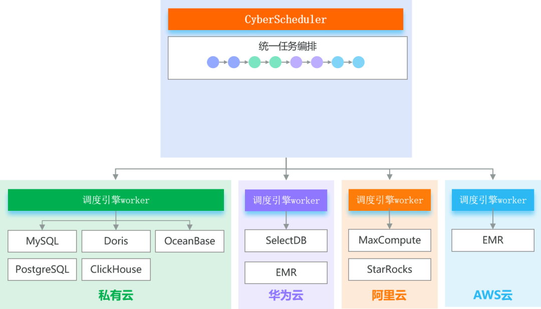 CyberScheduler 的核心突破之一,就是实现了"多云+多计算引擎"的统一编排与调度: