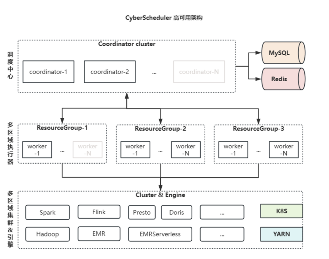 · 调度中心集群化:采用多 Coordinator 节点集群部署,配合 MySQL 存储元数据、Redis保障缓存高可用,实现调度中心的无单点故障;