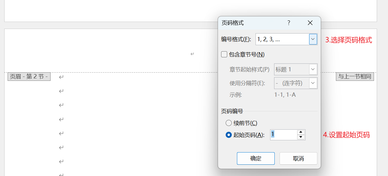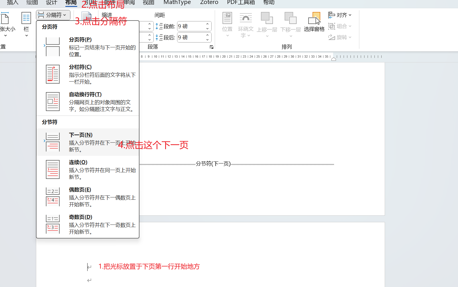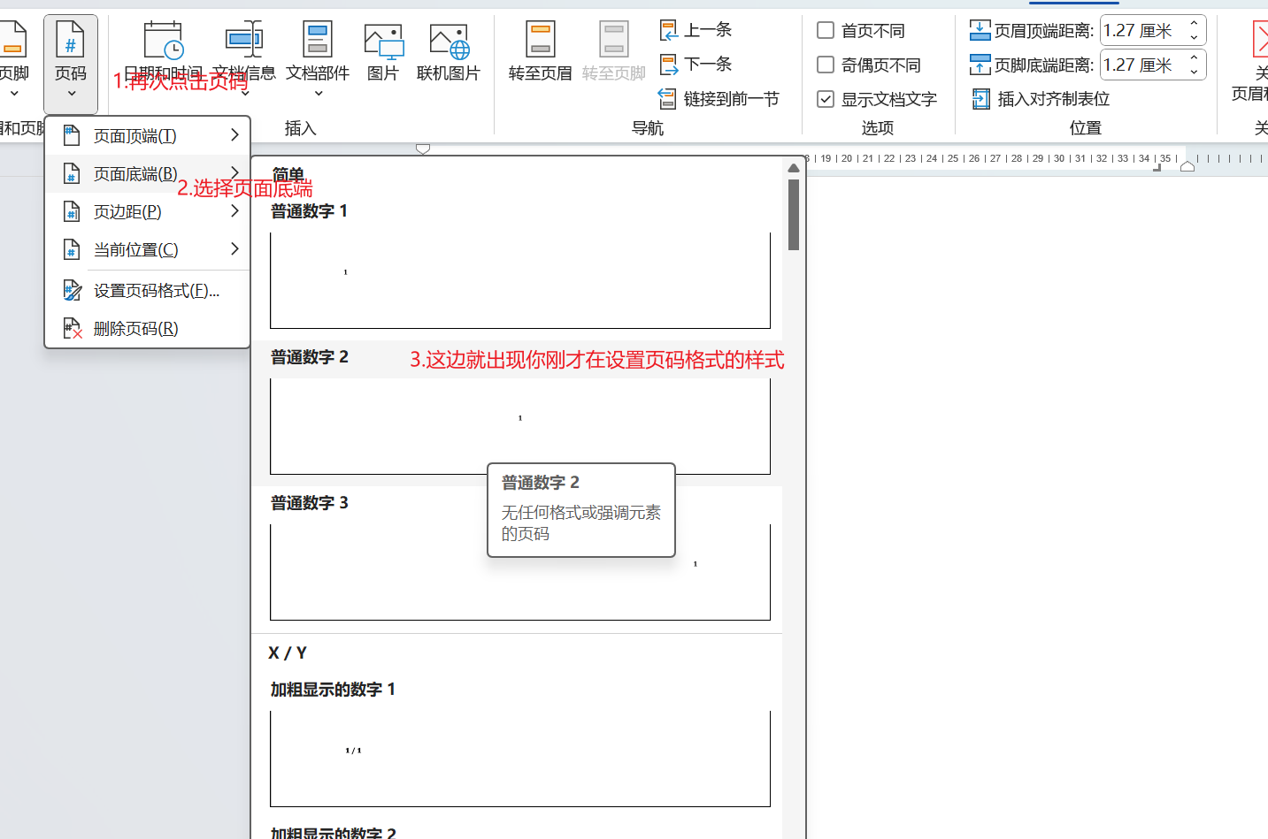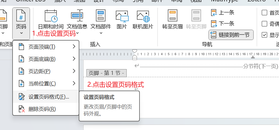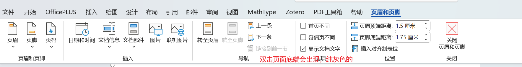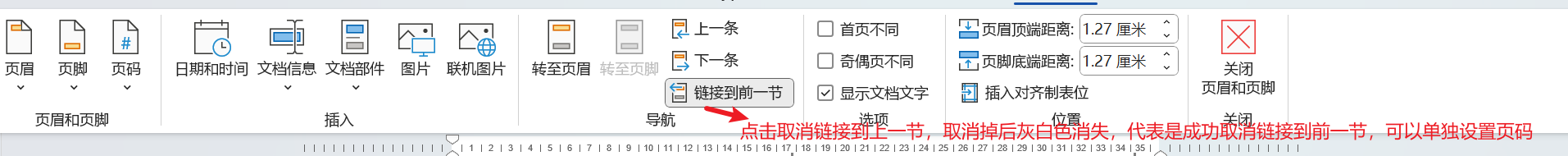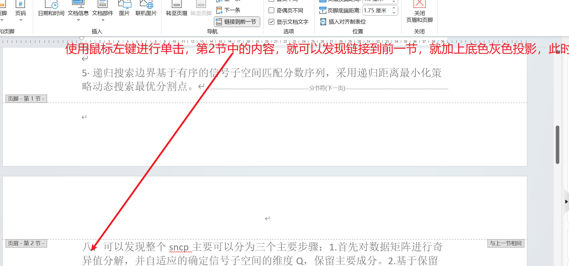 2.点击页面底端(要双击),会出现页眉页脚设置页面,把链接到上一节取消。