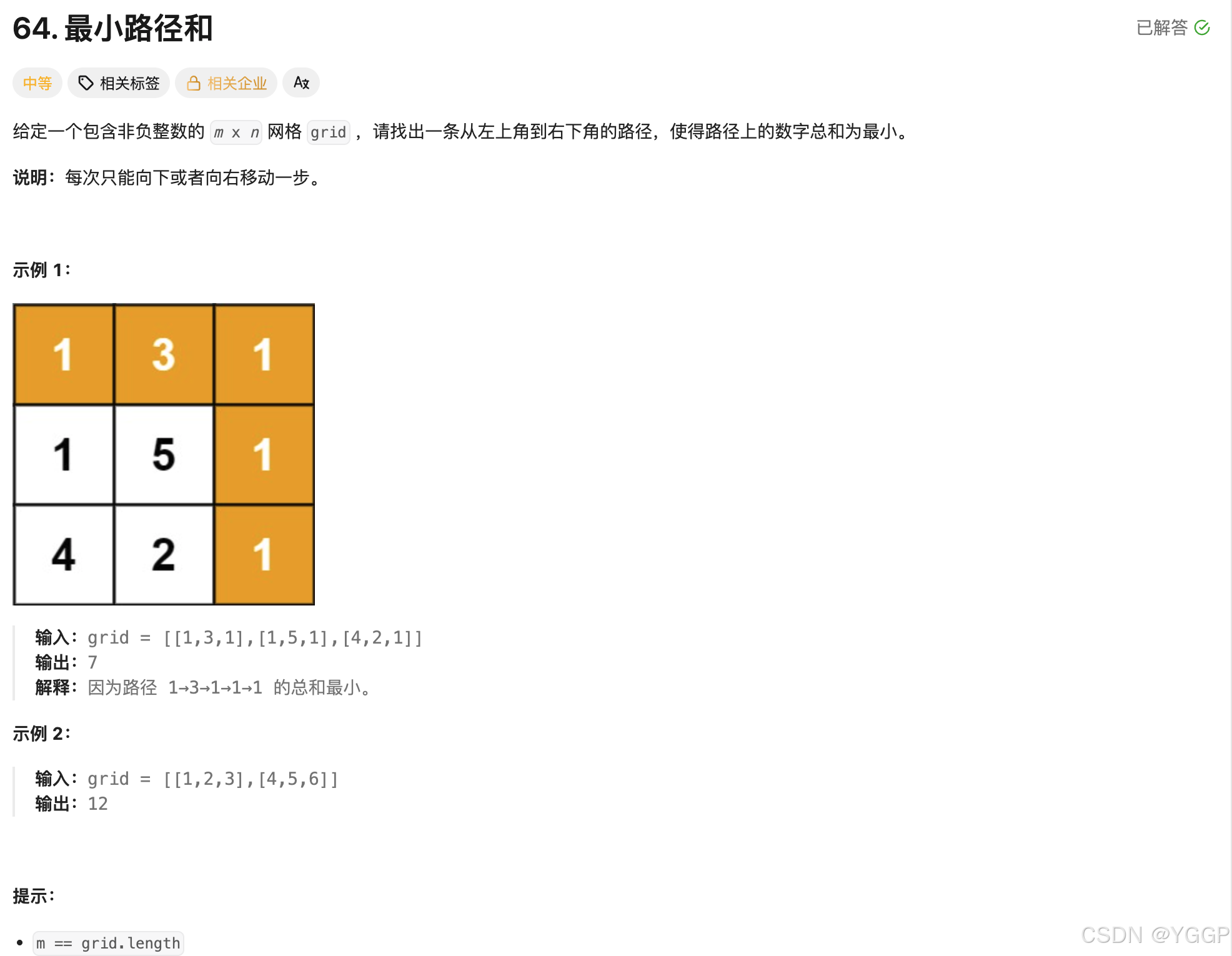 解决这道题的思路其实和「62. 不同路径」是类似的。我们使用二维动态规划来解决这个问题,维护一个dp二维数组,它的维度是(m + 1, n + 1)(m和n分别是数组grid的行数和列数)。