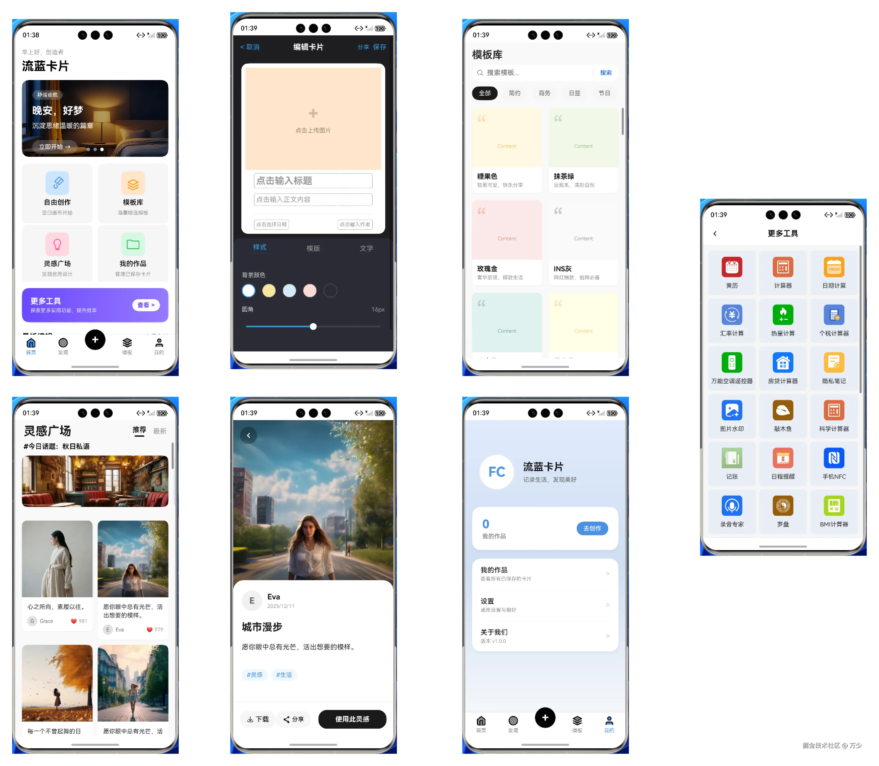 流蓝卡片是一款适配了的鸿蒙6-API20的HarmonyOS应用,目的在于给用户提供方便、简单的方式创建好看的卡片,用于将卡片发布到各种社交平台上。