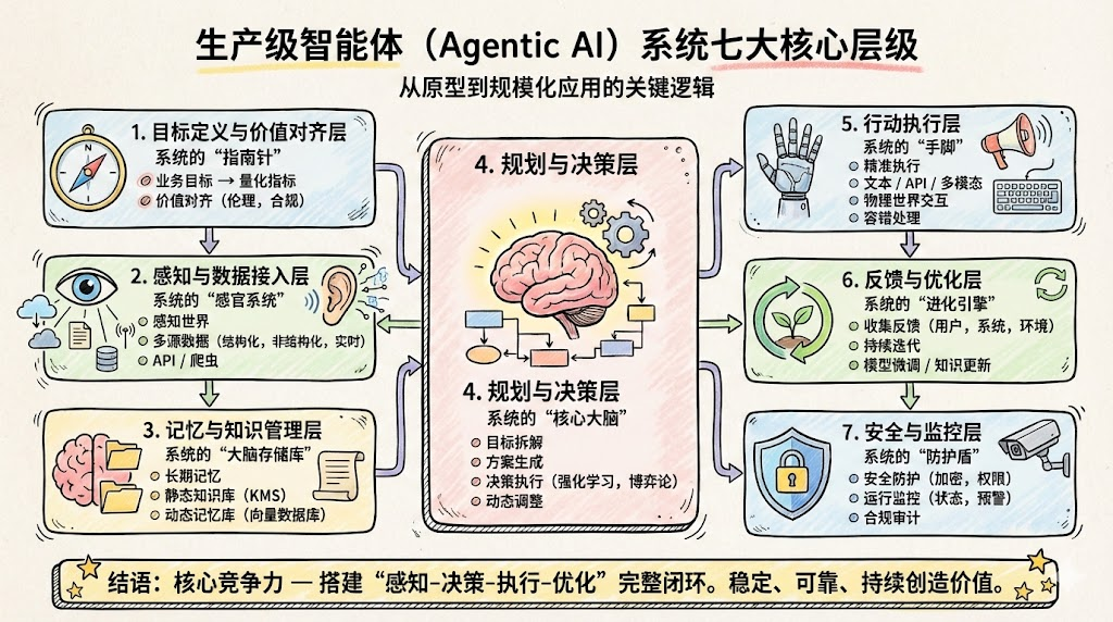 综合行业实践,可以把生产级智能体系统抽象为 7 个核心层级,它们形成一个"目标驱动的感知--决策--执行--反馈闭环"。