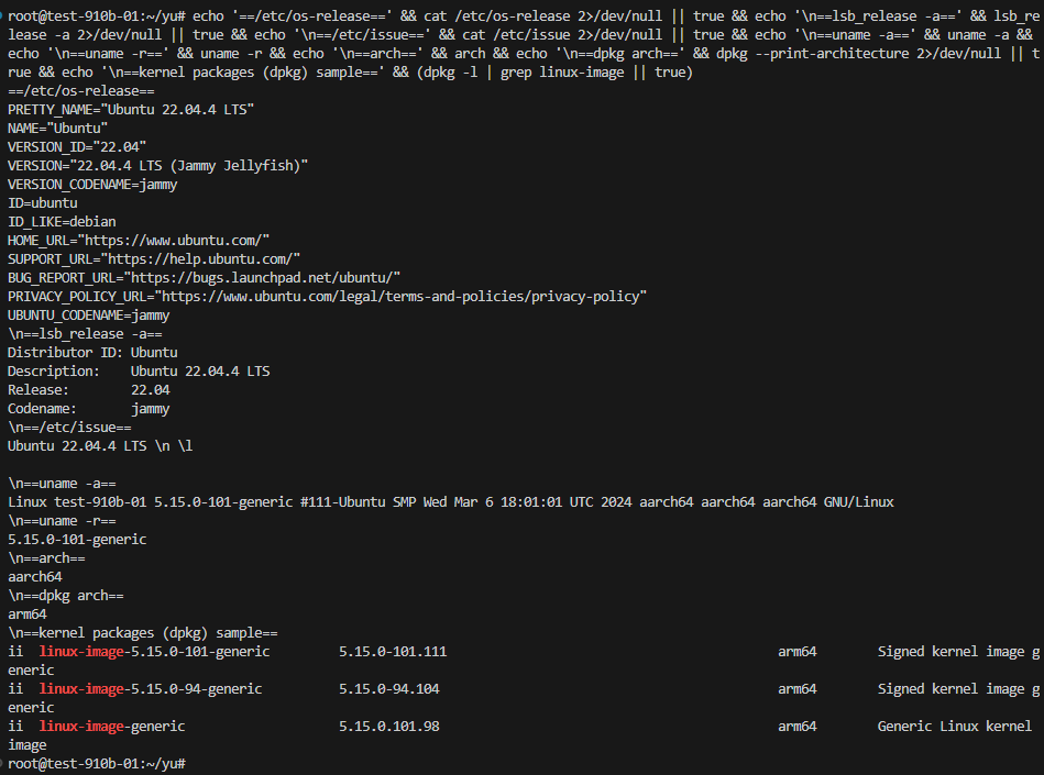 echo '==/etc/os-release==' && cat /etc/os-release 2>/dev/null || true && echo '\n==lsb_release -a==' && lsb_release -a 2>/dev/null || true && echo '\n==/etc/issue==' && cat /etc/issue 2>/dev/null || true && echo '\n==uname -a==' && uname -a && echo '\n==uname -r==' && uname -r && echo '\n==arch==' && arch && echo '\n==dpkg arch==' && dpkg --print-architecture 2>/dev/null || true && echo '\n==kernel packages (dpkg) sample==' && (dpkg -l | grep linux-image || true)