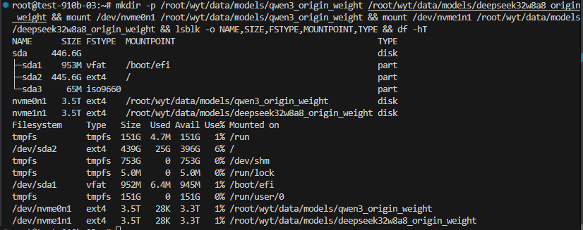 nvme0n1-> 挂载至/root/wyt/data/models/qwen3_origin_weight(用于存放 Qwen3-235B)nvme1n1-> 挂载至/root/wyt/data/models/deepseek32w8a8_origin_weight(预留给 DeepSeek模型)