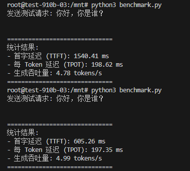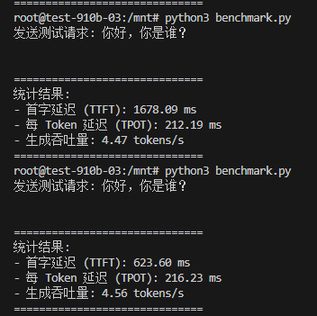 我们编写了 benchmark.py 进行流式推理测试,对比优化前后的效果。