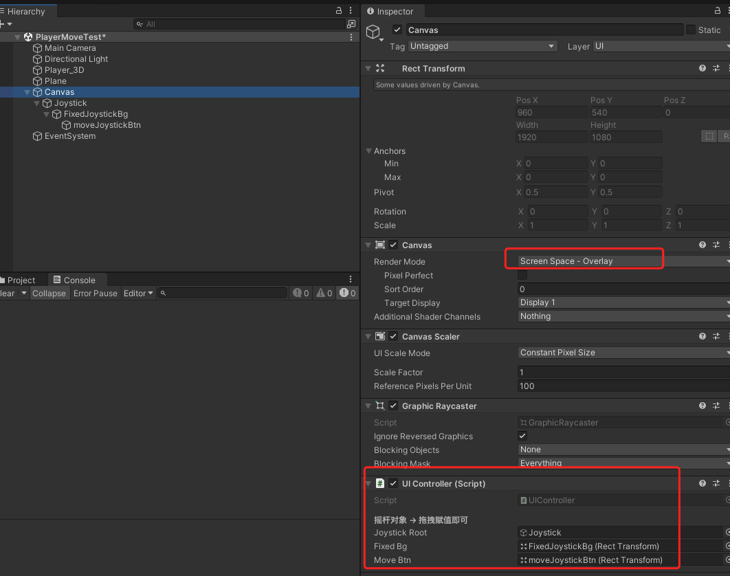 - 画布挂载脚本拖拽赋值(也可以挂载在JoyStick上)