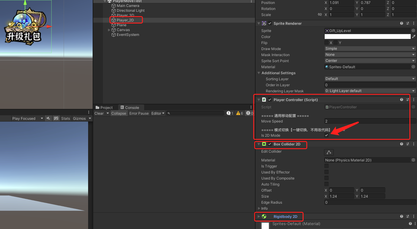 2D玩家的创建(需要在脚本上勾选Is2DMode!!!! )