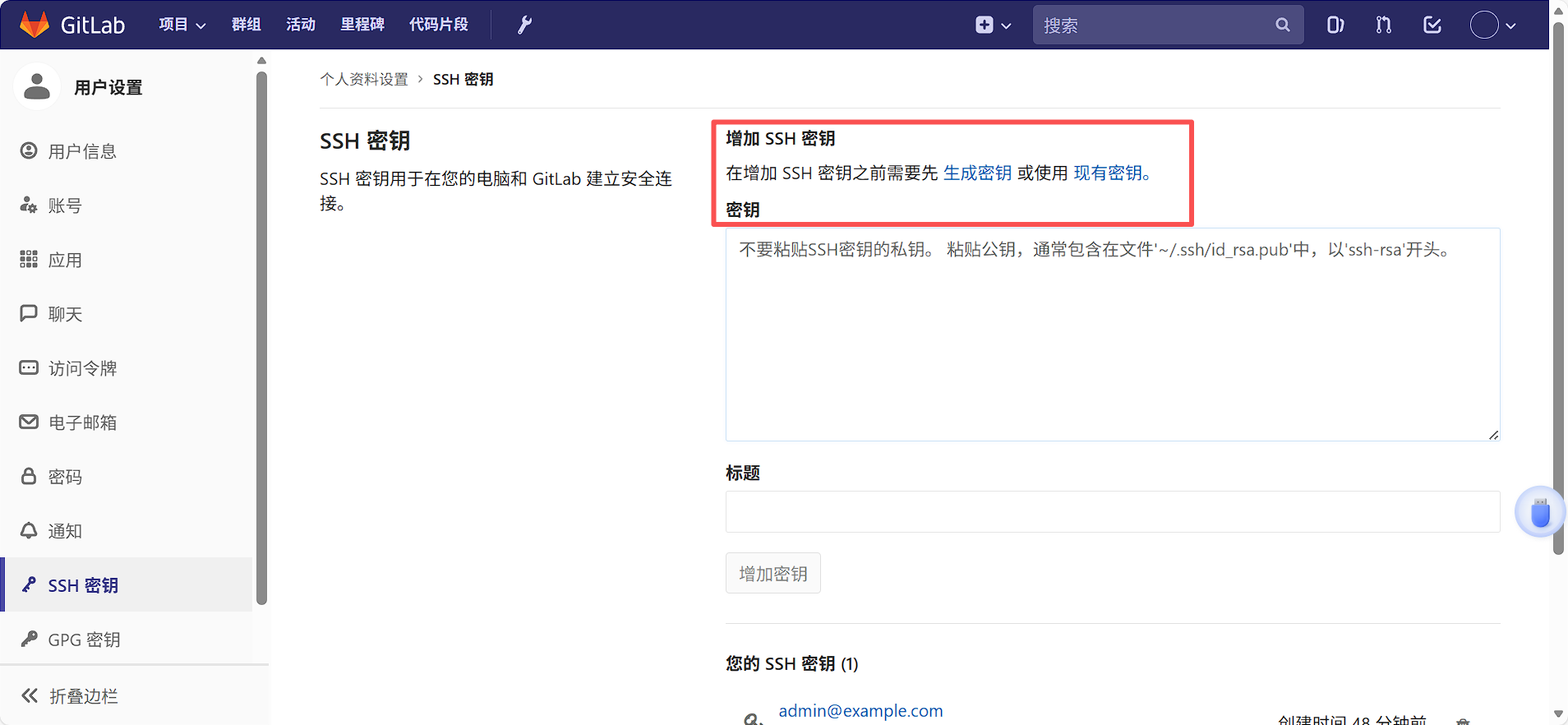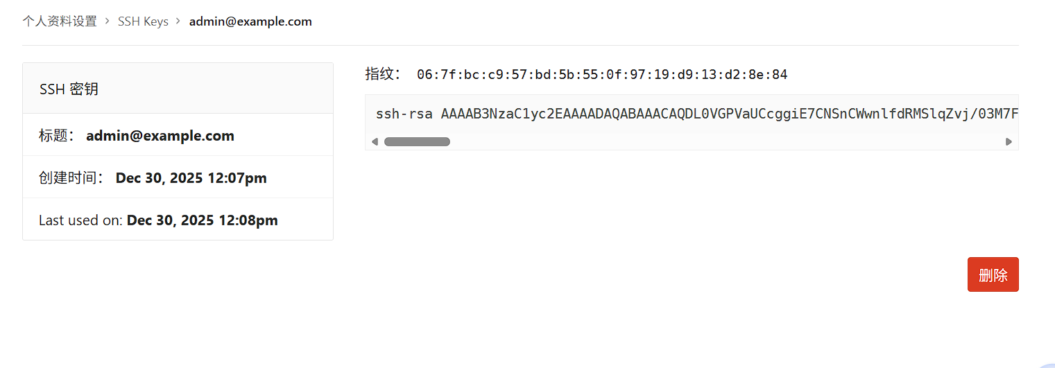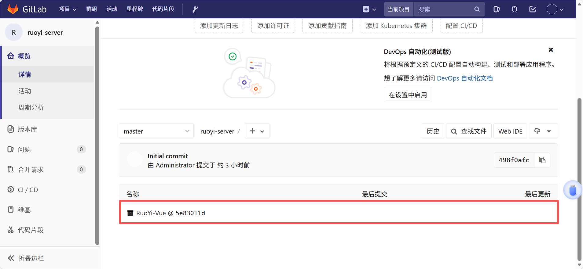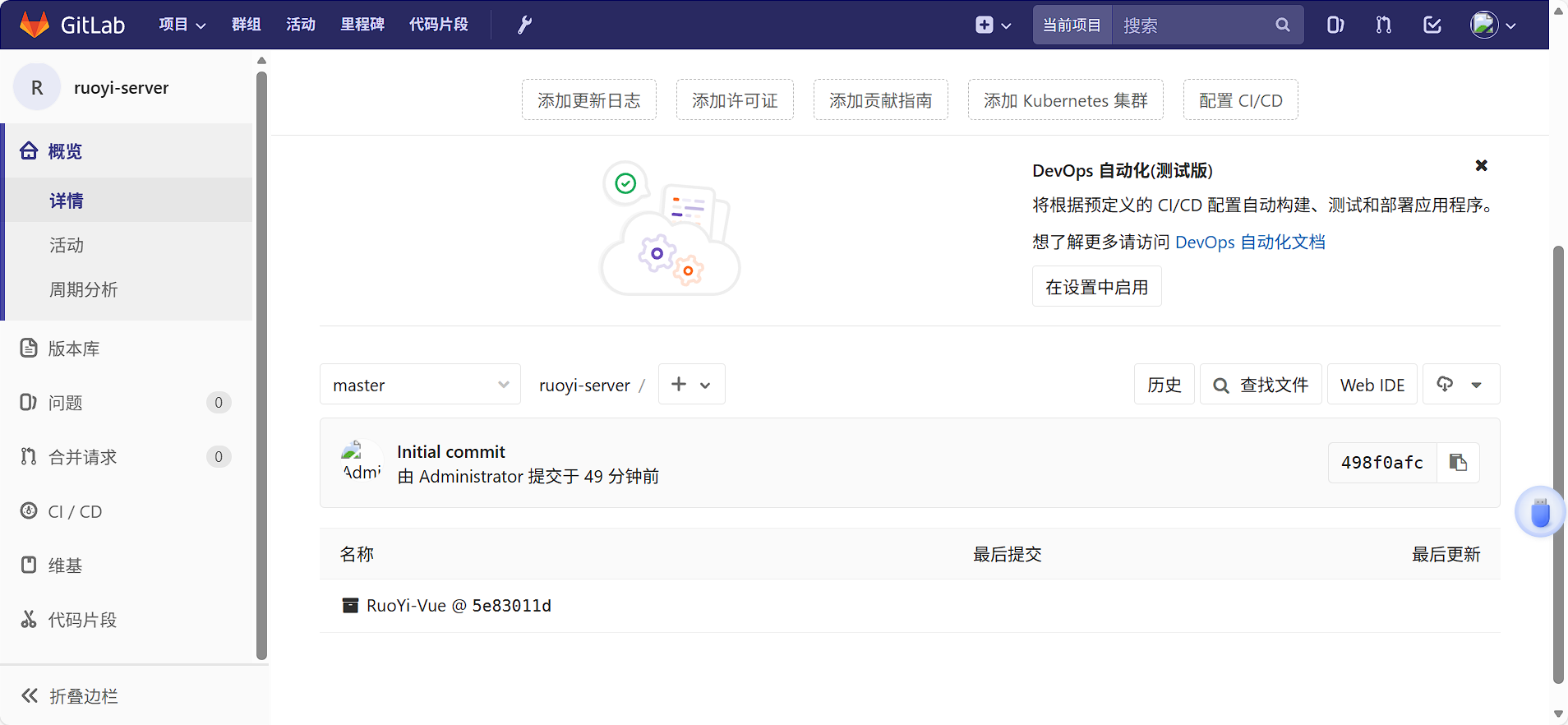 root@gitlab gitlab\]# docker start gitlab gitlab \[root@gitlab gitlab\]# docker ps  ### 5、初始化gitlab 的账户密码 访问主机IP地址+gitLab容器映射端口号80 (192.168.10.17:80)  ### 6、使用root 账号 + 新设密码登录  ### 7、配置SSH密钥 输入 ssh-keygen -t rsa -b 4096 -C "admin@example.com" ```bash [root@docker opt] ssh-keygen -t rsa -b 4096 -C "admin@example.com" # 邮箱填你之前配置的 git email Generating public/private rsa key pair. Enter file in which to save the key (/root/.ssh/id_rsa): Enter passphrase (empty for no passphrase): Enter same passphrase again: Your identification has been saved in /root/.ssh/id_rsa. Your public key has been saved in /root/.ssh/id_rsa.pub. The key fingerprint is: SHA256:YA7Qy8O4v4dTk7eu+DApyNneFYO7Zd57S+/04qt9wfQ admin@example.com The key's randomart image is: +---[RSA 4096]----+ | .. | | .. | | +..o | | . =+.. . | | . o.+S o .| |..+ .= + oE| |.o.o++ * . . . .| | ..=+B o ..+... | | .oBo+.ooo=*+. | +----[SHA256]-----+ [root@docker opt]# cat ~/.ssh/id_rsa.pub #查看自己的私钥对 一般是由rsa开头 ``` **在gitlab -ui界面中配置ssh密钥**    ### 8、前后端代码下载上传 #### 8.1、下载若依项目 [https://gitee.com/y_project/RuoYi-Vue](https://gitee.com/y_project/RuoYi-Vue "https://gitee.com/y_project/RuoYi-Vue") **下载 命令** ```bash git clone https://gitee.com/y_project/RuoYi-Vue.git ``` #### 8.2 查看若依项目编辑 #### 8.3 上传 若依项目 到 gitlab ```bash $ cd RuoYi-Vue/ #在当前目录初始化一个 Git 本地仓库。 git init #为本地仓库添加一个远程仓库地址,名称为 origin。 git remote add origin http://192.168.10.17/root/ruoyi-server.git #将当前目录下的所有文件加入暂存区。 git add . #将暂存区的文件提交到本地仓库,并添加提交说明"Initial commit"。 git commit -m "Initial commit" #将本地 master 分支推送到远程仓库 origin,并建立默认的上游分支关联。 git push -u origin master 顺序 初始化本地 Git 仓库 → 关联远程仓库 → 提交代码 → 推送到远程仓库 ``` 注意 : 如果中途添加本地仓库地址有报错原因是 当前 Git 仓库中已经存在名为 origin 的远程仓库,所以不能重复添加 ```bash git remote -v #查看已有的远程仓库 ``` 解决方式 ```bash 方式一 #只是修改 origin 的地址(最常见) git remote set-url origin http://192.168.10.80/root/ruoyi.git 方式二 #先删除再重新添加 git remote remove origin git remote add origin http://192.168.10.80/root/ruoyi-server.git 最后改完直接上传 git push -u origin master ``` ##### ③ 在gitlab上查看项目