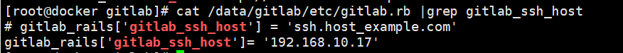 [root@gitlab gitlab] sed -i "/gitlab_ssh_host/a gitlab_rails['gitlab_ssh_host']= '192.168.10.17' " /data/gitlab/etc/gitlab.rb
