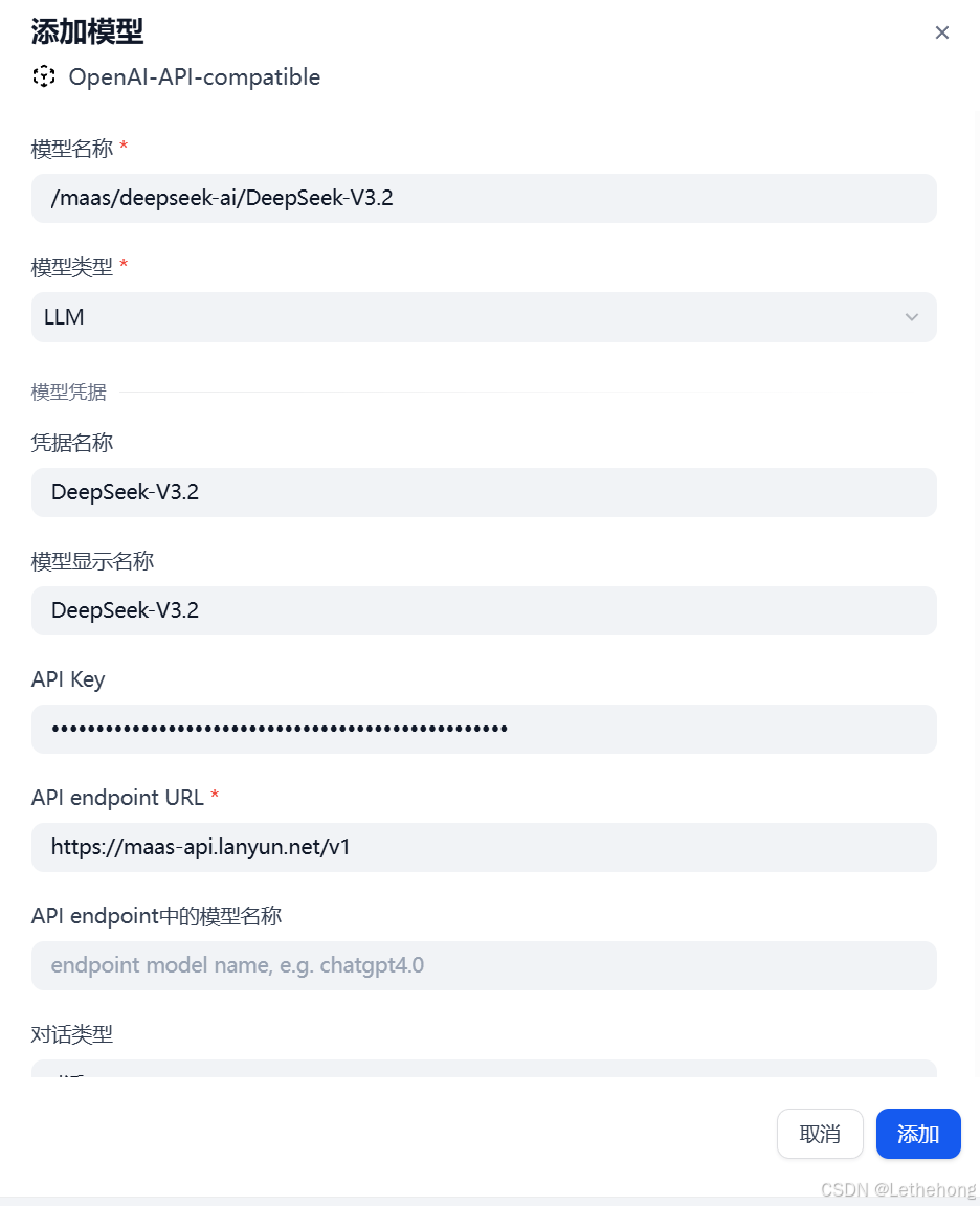 在本文的实战中,我们选择兼容蓝耘MaaS平台的 OpenAI-API-compatible 供应商进行配置,正是利用其兼容 API 的模型部署与推理能力------无需自行搭建底层算力或模型服务,只需将整理好的数据发送给模型,即可获得分析与生成结果。