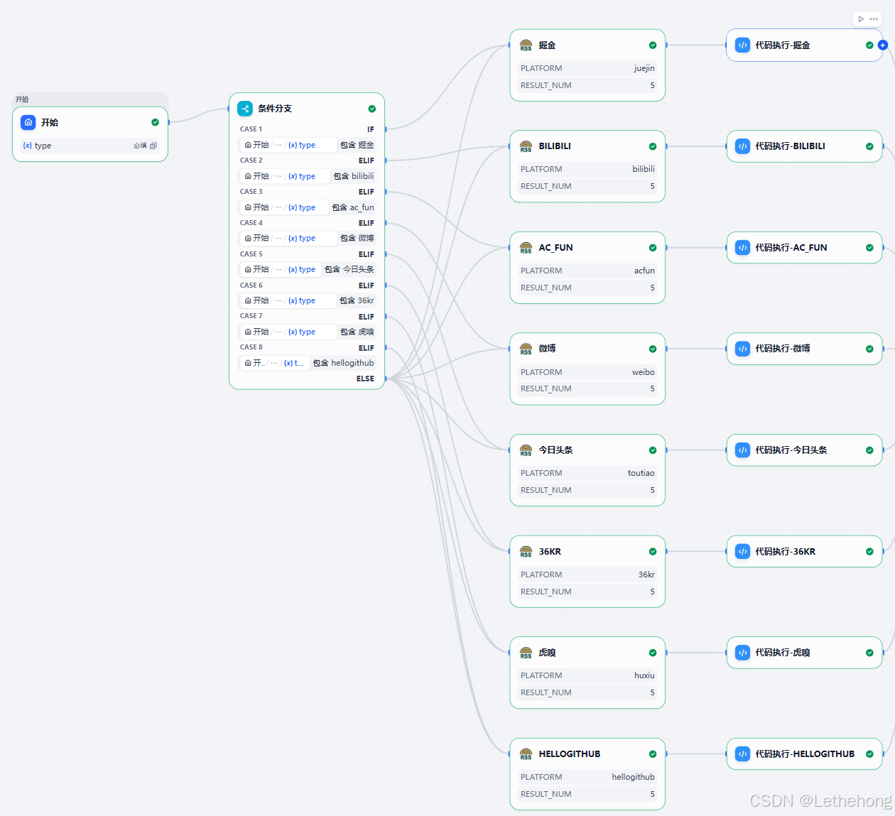 条件分支用于判断当前运行需要处理哪个平台的数据,举例判断字段 platform 的取值:"juejin", "bilibili", "weibo",或者 "all"。每个分支会把 arg1(原始 JSON)丢给对应的解析脚本或同一解析器的不同适配器。
