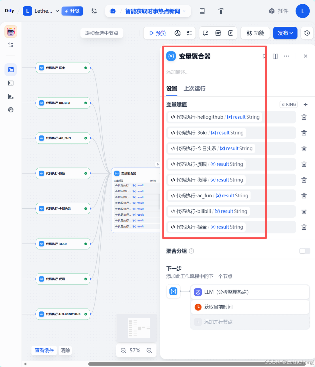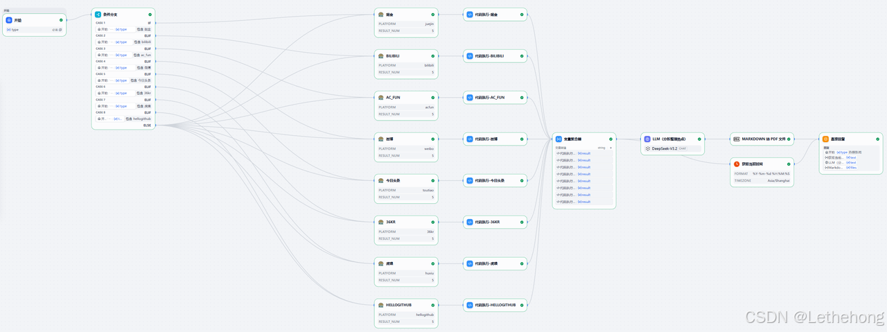在信息高度分散的时代,热点内容散落在掘金、B 站、微博、今日头条等多个平台,人工整理成本高且标准不统一。本文基于蓝耘MaaS和Dify实战搭建一套多平台内容聚合与大模型自动总结的工作流方案。通过统一解析各平台数据结构,将结果交由 LLM 自动生成结构化热闻摘要,并支持 Markdown / PDF 输出。整套流程覆盖数据采集、平台解析、变量聚合、模型调用与结果交付,可直接复用与扩展。适用于每日热闻汇总、舆情监测及自动化内容运营等实际场景。