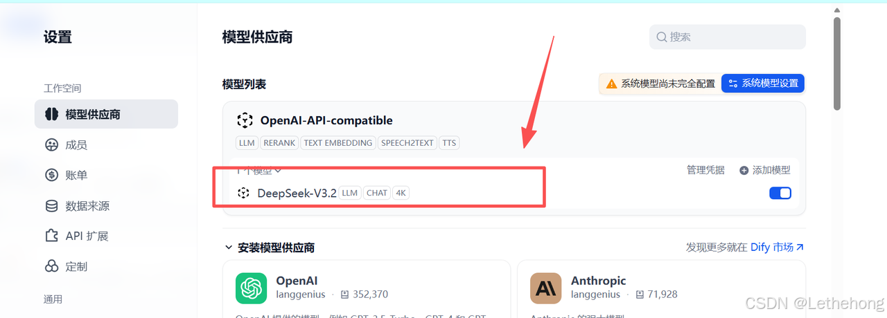 1、点击右上角头像 → 设置 → 模型供应商(Model Providers)→ 选择 OpenAI-API-compatible