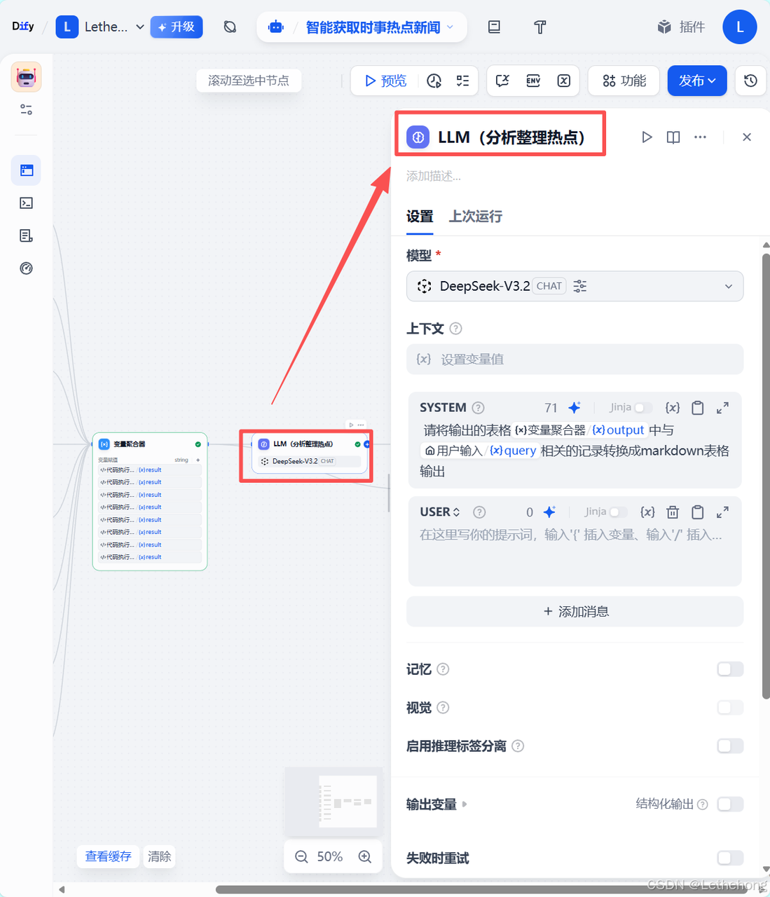 2、在"模型调用"节点里选择 deepseek-v3.2 并设置合适的 temperature、max_tokens、和 system prompt(比如"你是一位清晰、专业的内容编辑,给出要点式总结并加入发布时间")。