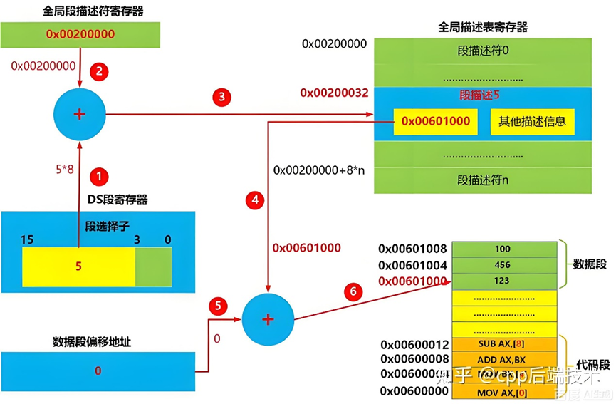 最终 CPU 通过计算出的线性地址0x00601000,访问对应的内存区域(图中该地址属于 "数据段",存储着123等数据)。