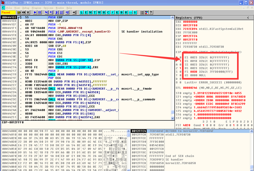 从 OD 截图右侧寄存器窗口可直观观察到:如DS=0023、FS=003B、CS=001B等,这些十六进制数值就是 16 位段选择子的真实表现,也是段寄存器对外可见的唯一内容。