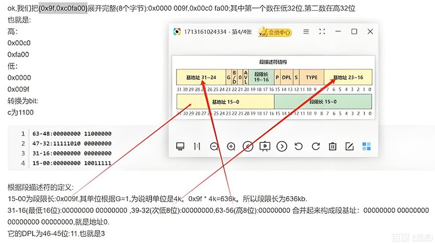 定义:段的起始线性地址,是地址计算的基准,对应图片中段描述符的 "基地址" 拼接字段。
