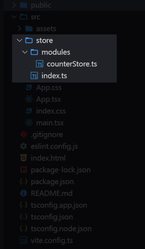 store/index.ts代码tsimport { configureStore } from '@reduxjs/toolkit'; // 导入子模块reducer import counterReducer from './modules/counterStore.ts'; const store = configureStore({ reducer: { counter: counterReducer, }, }); export default store; -
