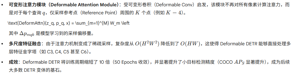 Deformable DETR 是 DETR 发展史上的最重要里程碑之一。Zhu 等人指出,Transformer 的全图注意力是极其低效的,因为对于特定的物体,只需要关注其周围的一小部分关键区域。