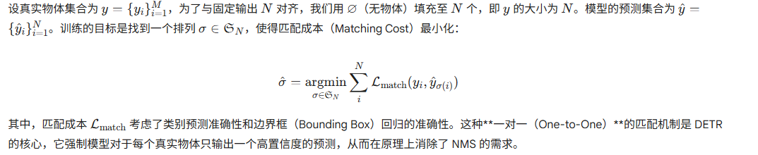 为了实现端到端的训练,DETR 必须解决"哪个预测对应哪个真实物体"的问题。在密集预测中,这是通过空间位置对齐来解决的。而在 DETR 中,预测结果是无序的集合。因此,DETR 引入了基于**匈牙利算法(Hungarian Algorithm)**的最优二分图匹配。