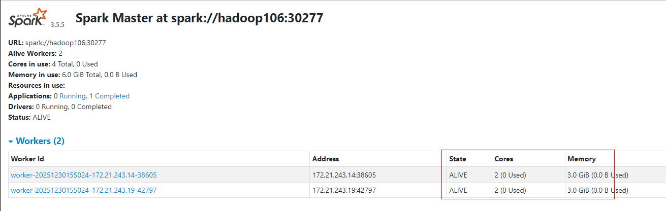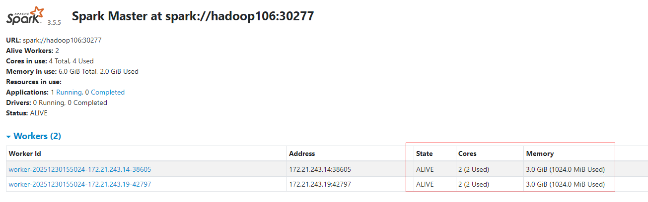 启动Standalone集群,集群中包含2台Worker节点,每台Worker节点配置2core和3G内存: