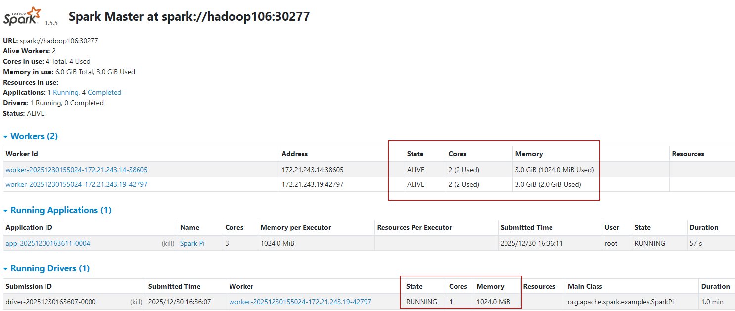 提交任务后,可以通过WebUI查看当前Application使用资源情况,Driver在其中一台Worker节点启动,使用2core和2G内存。