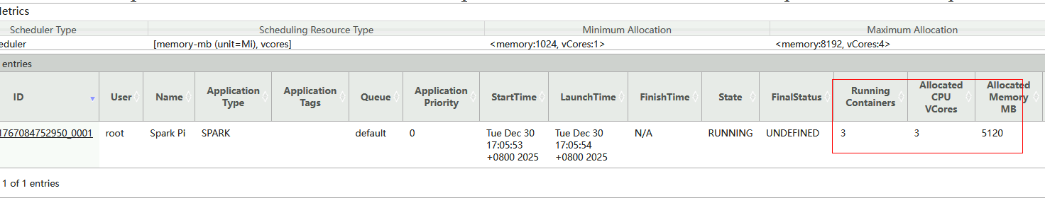 提交任务后,可以通过WebUI查看当前Application使用资源情况:"ExecutorLauncher"使用1G+1Core资源,启动2个Executor,每个Executor使用2G内存(1024M+384M=1408M,向上取整为2048M)+1Core资源,所以总共在Yarn中使用3Core和5G内存(5120M)。