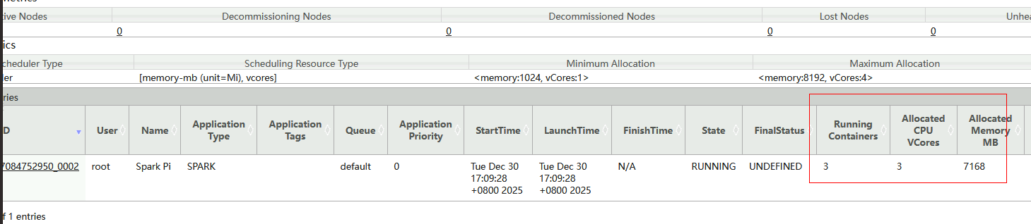 提交任务后,可以通过WebUI查看当前Application使用资源情况:"ExecutorLauncher"使用1G+1Core资源,启动2个Executor,每个Executor使用3G内存(2048M+384M=2432M,向上取整为3072M)+1Core资源,所以总共在Yarn中使用3Core和7G内存(7168M)。