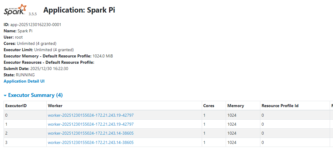 提交任务后,可以通过WebUI查看当前Application使用资源情况,可以看到程序使用了集群中所有worker的core资源,在每个Worker节点上启动了2个Executor,每个Executor按照指定的参数使用了1core和1G内存。