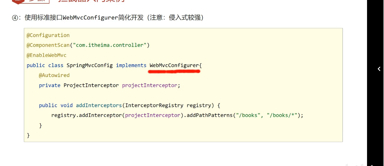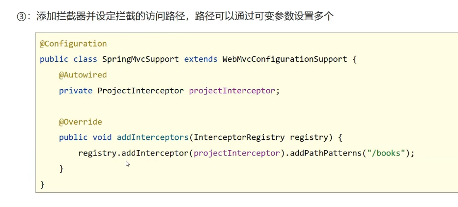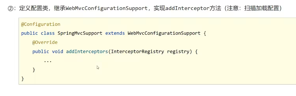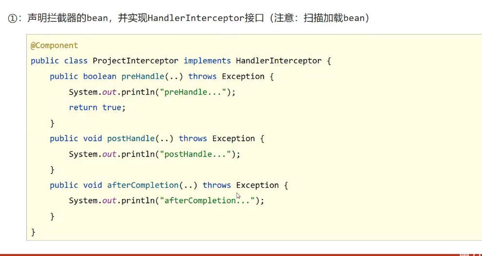 声明拦截器的bean,并实现HandlerInterceptor接口(注意: 扫描加载bean)