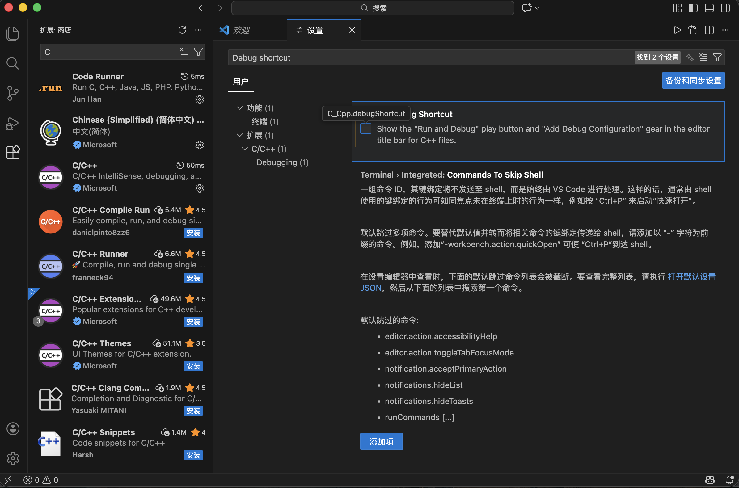 安装完成后点击左下角的设置,搜索Debug Shortcut,并取消它的勾选;