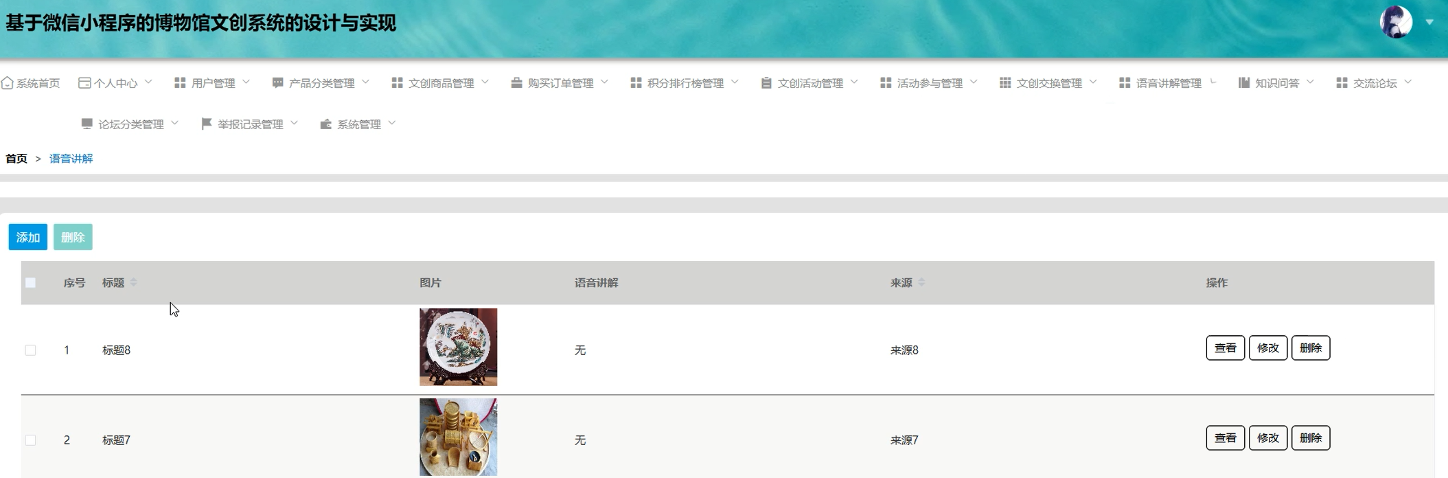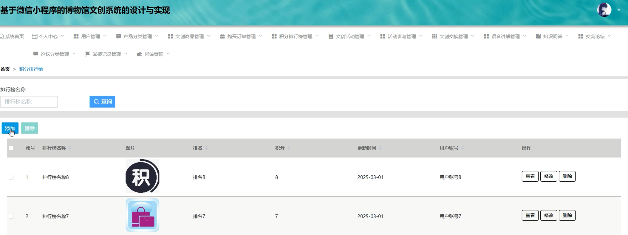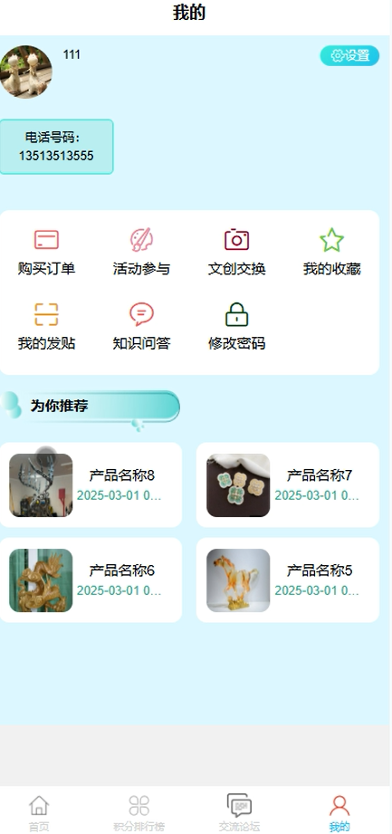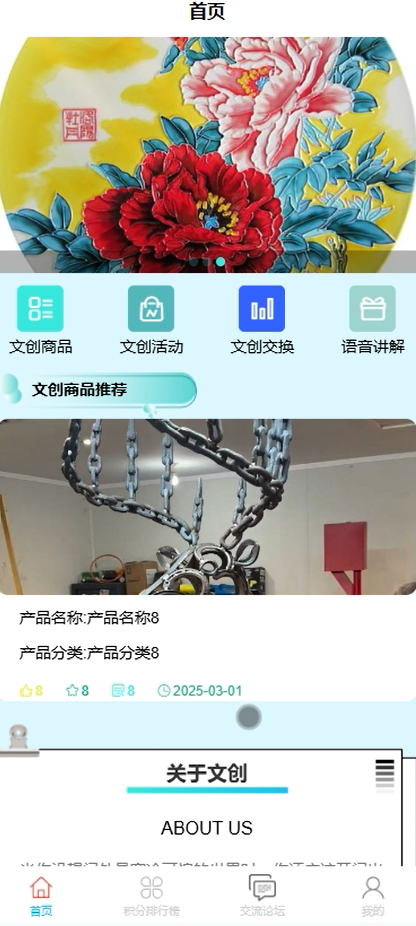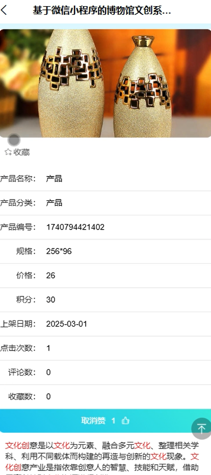 基于微信小程序的博物馆文创系统不仅为博物馆文创产品的数字化推广提供了新思路,还通过整合文创商品展示、语音讲解、积分排行榜、交流论坛等功能,构建了全方位的文化互动生态。系统利用微信小程序的便捷性与高效性,降低了开发成本,提升了用户体验,符合移动互联网"微、小、轻"的发展趋势。同时,系统通过精准推荐算法与情感化设计理念,将文化元素与用户需求深度结合,增强了文创产品的情感价值与文化内涵,促进了博物馆文化的传播与教育功能的发挥,为公众提供了更加沉浸式的文化体验。