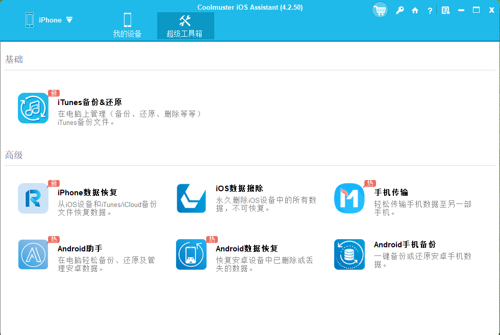 01将您的 iOS 设备连接到电脑并启动软件。程序检测到您的设备后,导航至"超级工具包"部分。\