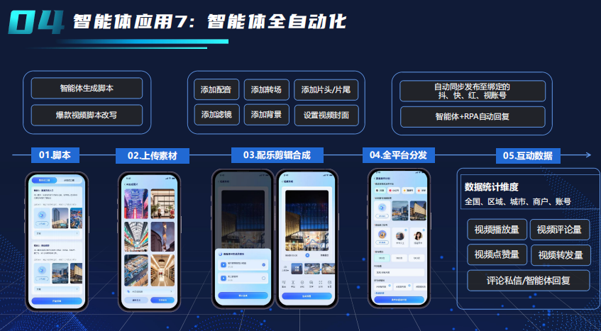 AI智能内容生成与优化 :集成AIGC能力,自动生成视频脚本、进行爆款改写,并能完成素材匹配、配音、添加转场/滤镜/片头片尾等后期处理,极大降低内容生产成本。