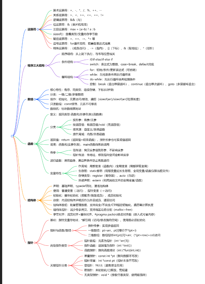 \]下标运算符 \&取地址运算符 \*指针运算符 ### 标准输入与输出 printf scanf scanf("%s%d",\&a,\&b); ### 程序的三大结构 顺序结构 特点:程序从上往下依次进行,语句的执行与书写的位置有关 条件结构 if if else if else if switch(常量表达式) //switch后小括号中的表达式的计算结果必须是一个整数 { case 常量表达式:语句块:break; ... default: 语句块n+1; } 循环结构 for for(初始表达式;条件表达式;更新表达式) { 循环体 } 初始表达式:在运行for的循环过程中,只执行一次,可以省略 条件表达式:检测结果作为是否退出循环的标准,可以省略 更新表达式:每次执行完循环体,会执行更新表达式,它可以省略 while构建的循环 while(条件表达式) //执行时先检测条件,根据结果来确定是否进入循环体 { 循环体 } do { }while(条件表达式); break,coninnue 主要用在循环体中 break:退出当前的单层循环 continue:退出当前循环中的一次循环 goto也可以用来实现构建环循环结构 注意:一般多用来退出多层循环的场景 ### 数组 存放同类型数据的有序集合 特点:有序的,元素在逻辑和物理上连续的 可以通过下标对数组中的元素进行访问,下标从0开始 它是一个可以容纳多个数据个体的集合 一维数组 数据类型 数组名\[常量表达式