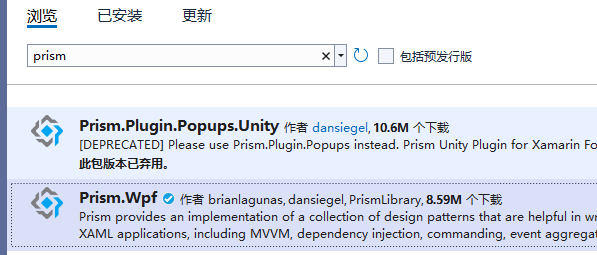 在后面我们会使用依赖注入,所以还需要安装一个Prism支持的DI容器框架。