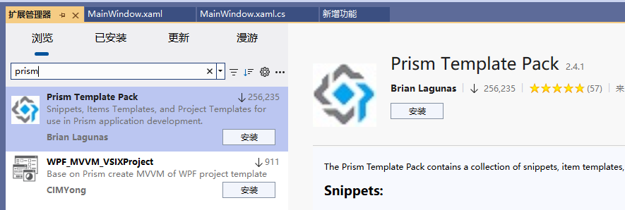 搜索prism,然后在搜索的结果中安装Prism Template Pack
