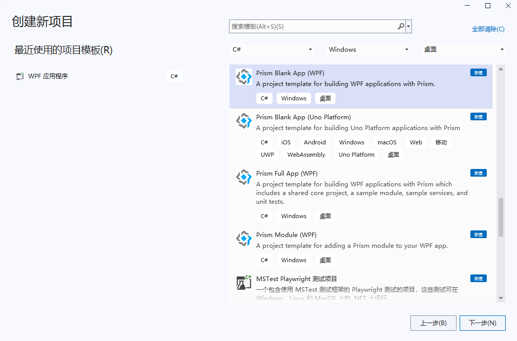 可以看到Prism Template Pack提供了Prism空程序、Prism完整程序和Prism模块等项目选项。