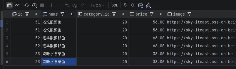 这里由于是left join 只保留了一个Id 所以将查询出的Id同样给到了dishId