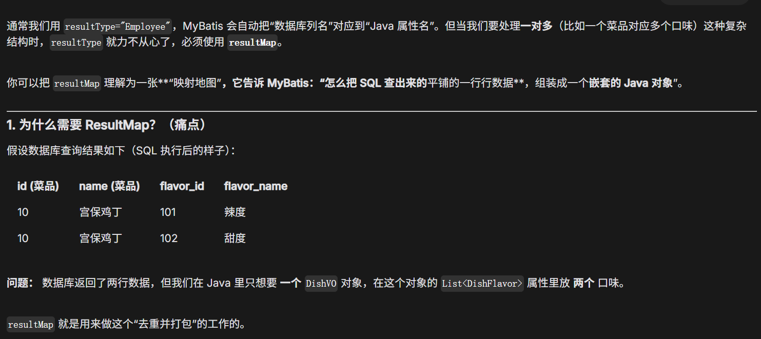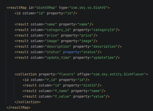 首先id字段用的是<id 表明这个如果后续碰到同样id的行就是同一个菜品,但是不同的flavor。