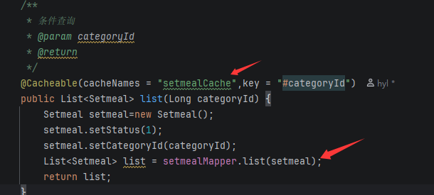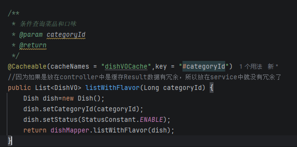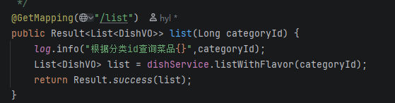 现在的逻辑就是前端传来categoryId,调用service得到List<DishVO>再直接return 如下图所示: