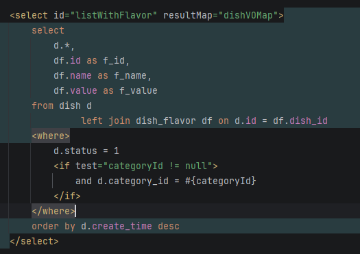 原理就是利用封装的dish查询并且联立flavor表通过dish.id==flavor.dish_id,但是由于一个dish可能有多个flavor所以我们不能直接将查询结果封装进,而是通过XML映射。