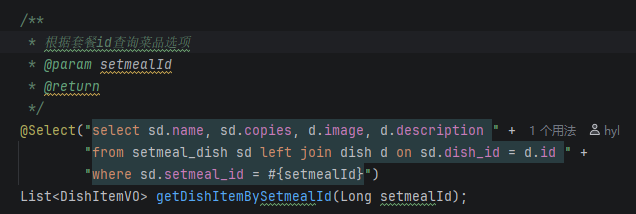 由于没有属性是list所以也不需要resultMap只需要对应封装就好了,但是这个由于一个套餐可能有多个Dish组成,所以我们返回的是List<DishItemVO>并且setmeal表中不含有copies以及name这些字段所以又要进行表的联立,SQL如下图所示: