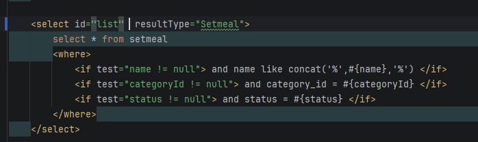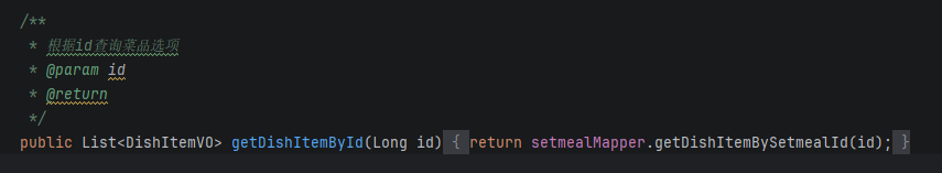 而套餐不需要,所以套餐直接返回的就是一个setmeal对象,查询出来的可以和setmeal一一对应上所以不需要resultMap。下图是service的代码: