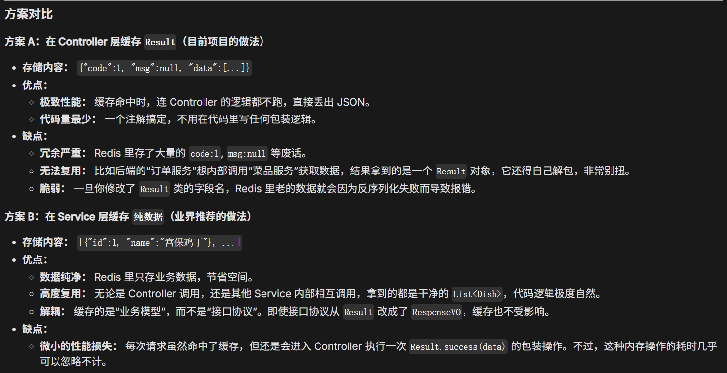 黑马教的是在controller中完成这个业务,这样的话实际上Redis存储的是Result对象,会有冗余等等原因如下图所示: