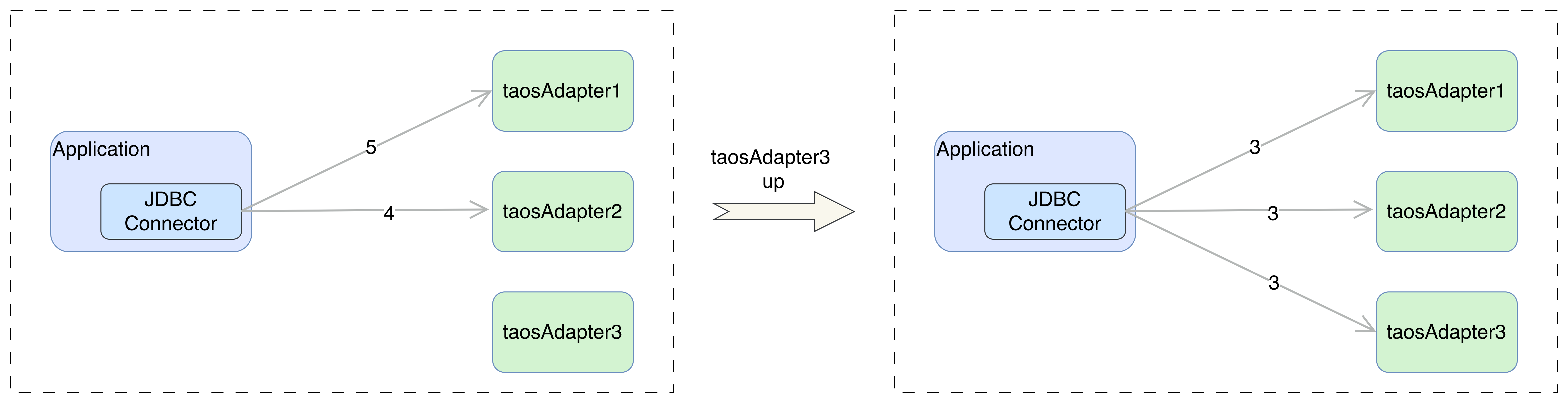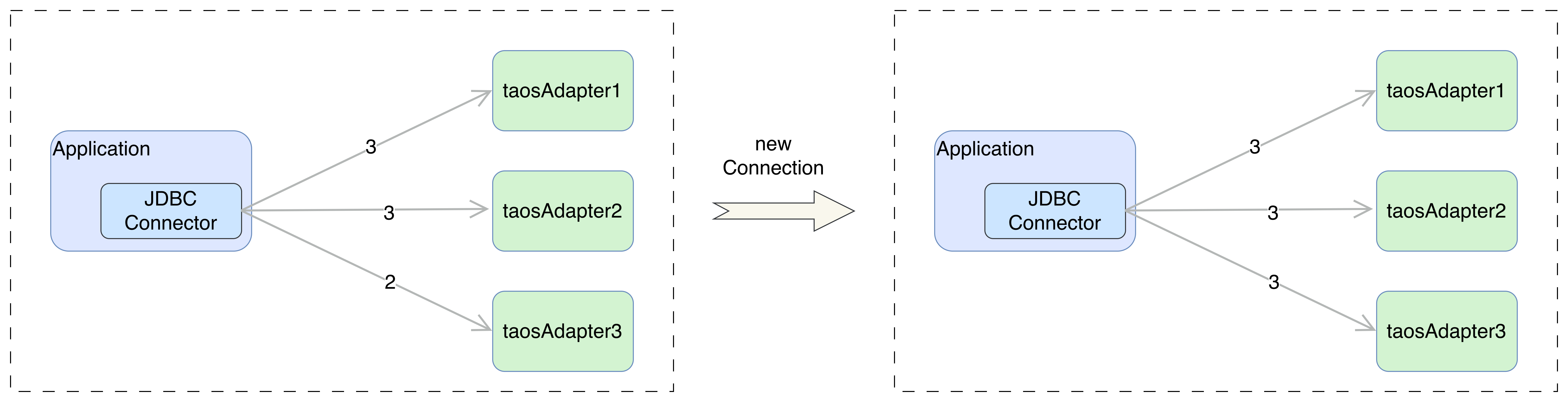 下图说明了新连接建立的时候,会选择连接数最少的 taosAdapter。