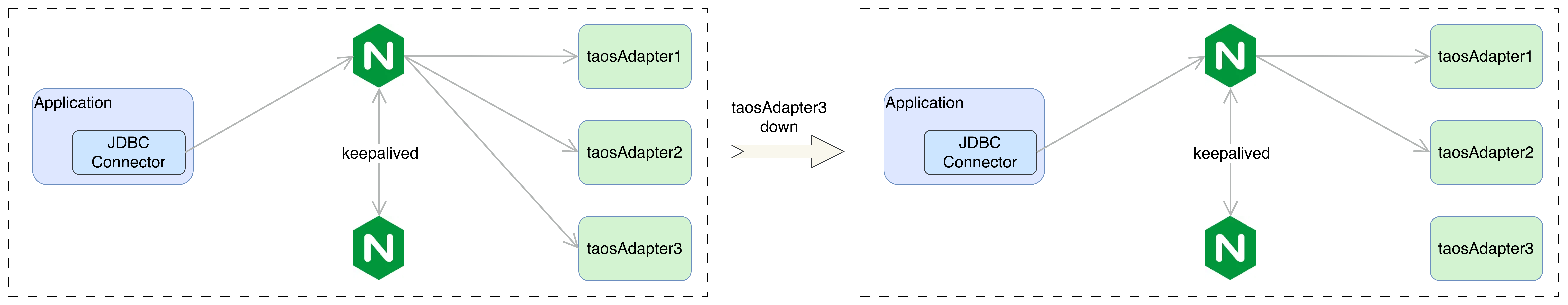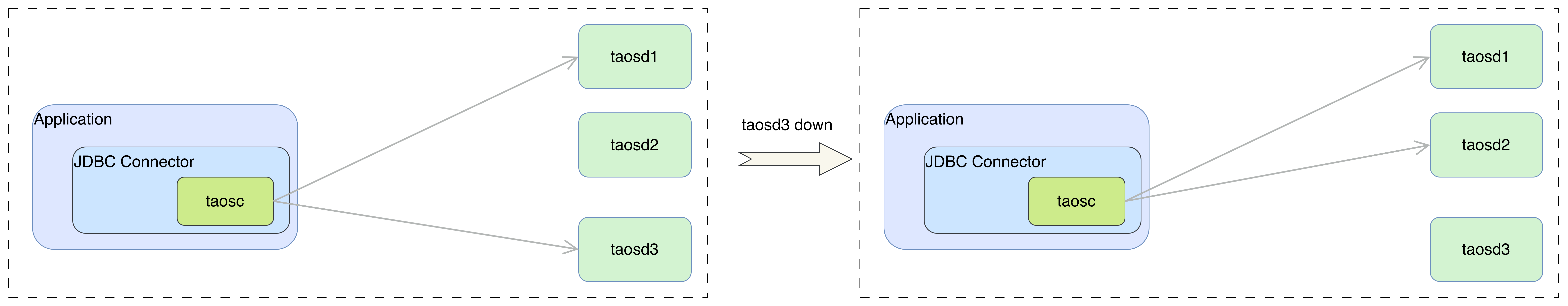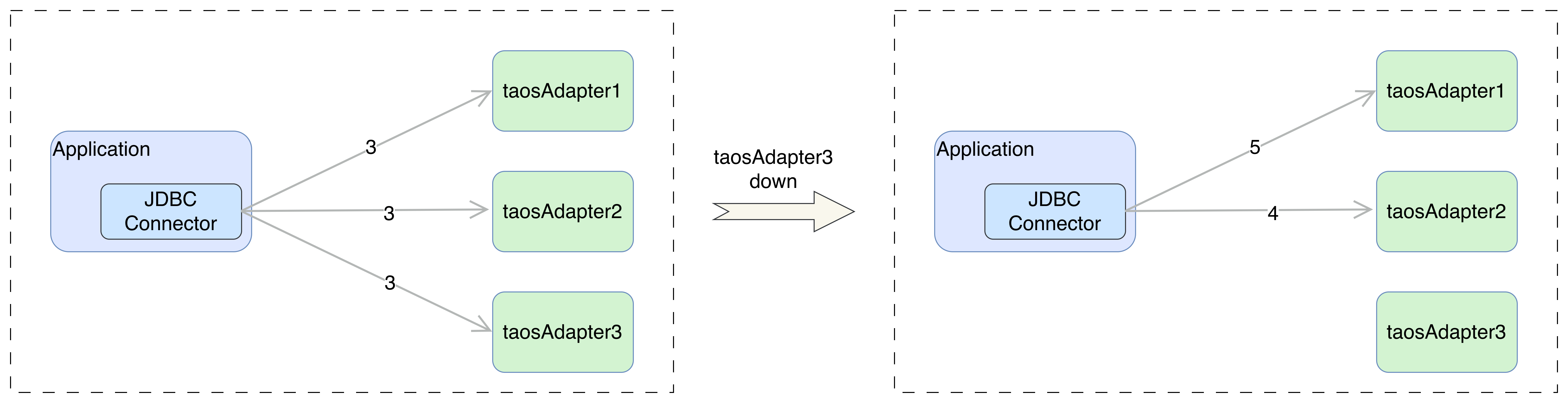 下图说明了当 taosAdapter3 节点故障导致连接断开时,JDBC 连接器自动迁移连接到 taosAdapter1 和 taosAdapter2。对于集群服务端选举或网络抖动造成的短时不可用,会通过 taosAdapter 调用的 taosc 客户端内部重试解决,具体可以参考原生连接 failover 部分。