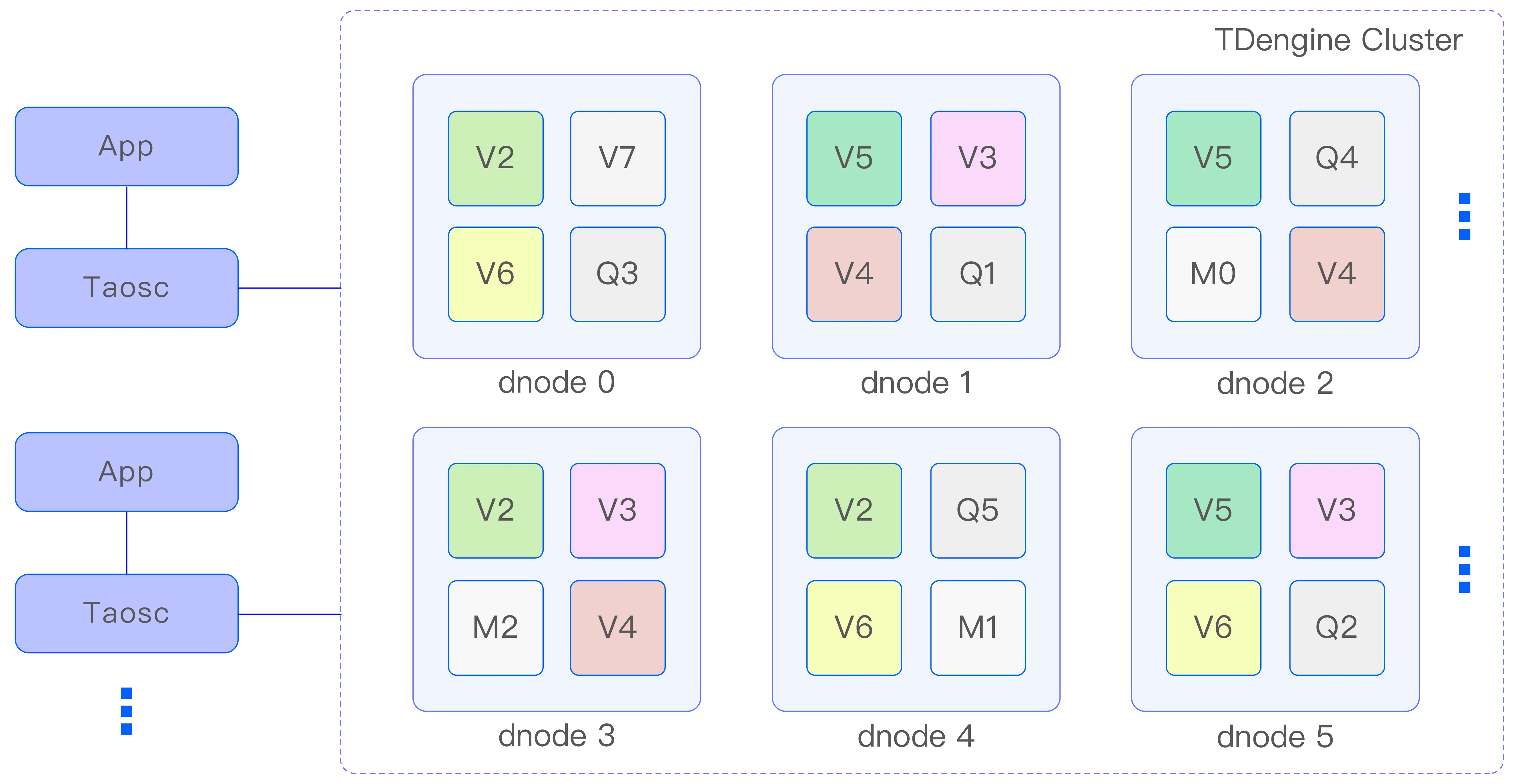 - 一个 dnode 上可以创建多个 vnode(图中 V2,V3 等),每个 vnode 属于一个数据库。