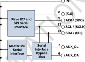 serial interface bypass mux接口旁路选择器:就是一个开关,如果拨到上面辅助的I2C引脚就和正常的I2C引脚接在一起,这样两路总线就合到一起了,STM32可以控制所有设备;如果拨到下面,辅助的I2C引脚就由MPU6050控制,两条I2C独立分开,STM32是MPU6050的大哥,MPU6050是扩展设备的大哥
